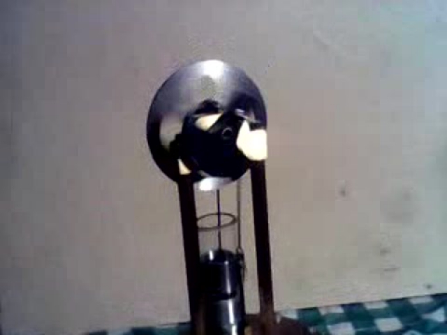 Távtartó csavarokat ismeretlen,ócskavastelepen talált lomból bontottam, menetes orsóval és csavaranyákkal kiválthatóak. A lendítőkerék is valami haditechnikából való.A tengely egy alumínium függönyrúd.6 mm átmérőjű, csapágyméretre csiszolva, a főtengely ellensúlyba beragasztva. Készült 2014 karácsonyán.